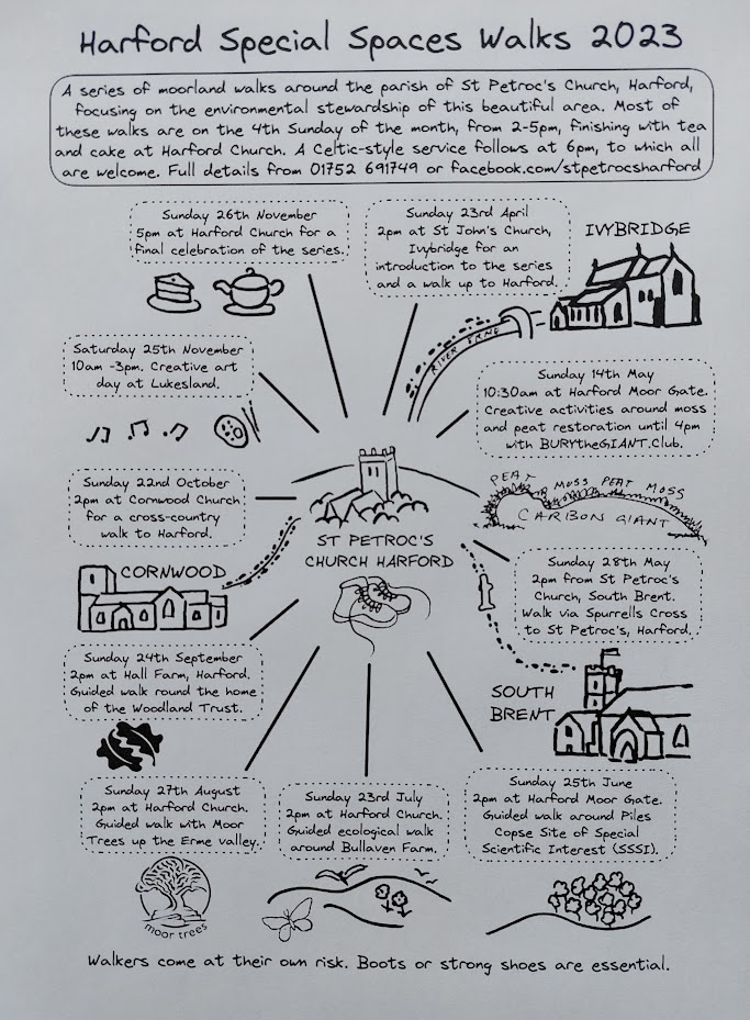 On Sunday 23rd April, the first walk of the Harford Special Spaces series will start at St John’s church, Ivybridge at 2pm. The route will go through the Cleeve to Lukesland, then across the moor to St Petroc’s Church, Harford. Here there will be tea and cake at 5pm, followed by a short Celtic style service at 6pm. All welcome. Full details below: