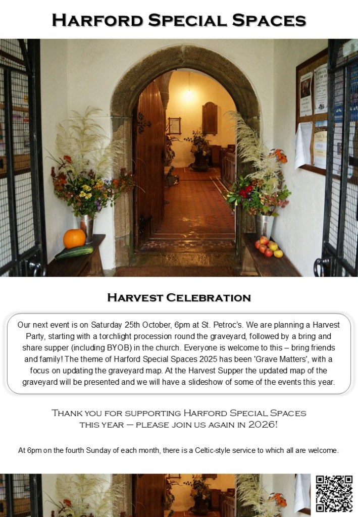 Saturday 25th October at 6pm Harvest Party in Harford Church – the final Harford Special Spaces event of 2025. All welcome! Oct 03 2025 Share this: Click to share on X (Opens in new window) X Click to share on Facebook (Opens in new window) Facebook Like Loading... Related Published by Lorna Howell View all posts by Lorna Howell